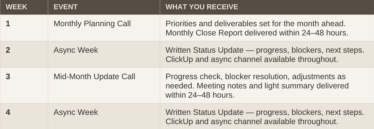 The monthly rhythm runs continuously. All inclusions are available— active workstreams are determined together each month. Your async channel and ClickUp are available throughout.